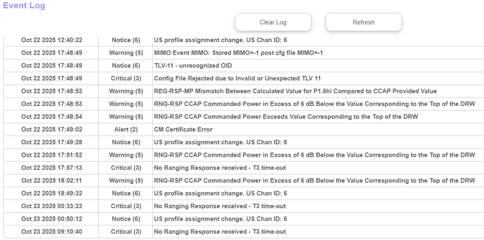 Any Criticals, Errors or Warnings seen in the event logs needs to be reviewed and resolved by the ISP. Indicates a signal issue on the ISP line up to the modem.