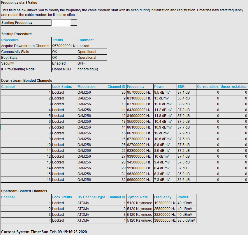 I haven't been resetting my modem, so the "correctables" and "uncorrectables" were just accumulating. Here is the data right after I got everything back up after removing my splitters. We don't actually use TV so they won't be necessary anyway.