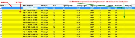 With the modem turned OFF, my listing no longer shows in the list of wifi's around me. I am going by my MAC ADDRESS and with power ON its there, power OFF its not. I see numerous other wifi's around me not broadcasting SSID and others that are. In the screen shot below it shows all wifi's I am detecting(mine has the MAC blocked out purposely). With the modem OFF the screen shot would be identical except that my listing within it is no longer there. In this screen shot you can see two other wifi's that are broadcasting the Company/Manufacturer name( NETGEAR modem and a 2WIRE).