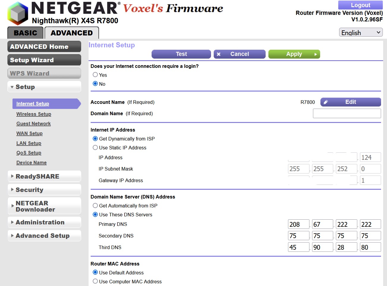 Further upstream, in my R7800 configuration, Advanced -> Setup -> Internet Setup it shows Internet IP Address - Get Dynamically from ISP. See attached. I have IPv6 enabled and configured as Pass Through.