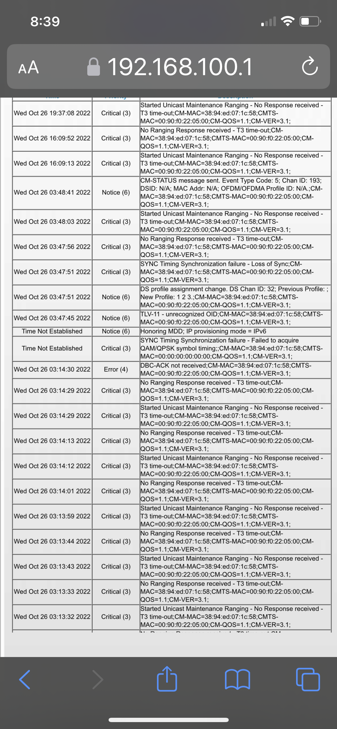 As the title states that is the problem. Xfinity is trying to tell me its my modem is bad. I suspect it is old cable lines that are making “ noise” in the line causing the poor connection. I was chatting with them the other day and they said they were going to restart my modem.They tried to restart it but said they could not find it and it must be offline. But i was streaming netflixxthe whole time, so how could gave it been offline. A while back the tech was here because of the same problem. There was a splitter in the line. And he discovered one of the lines off the split ( was not being used) was causing noise in the line. So he bypassed the line and connected the one main line together. It was fine for awhile but now back to same problem. some times the connection runs fine but then it will start crapping out. The other day i noticed the upstream light was flashing on the modem and it also turned red/orange at one point. Posting a photo of most current event log. Not sure how to create a file to get the full log here. Hope the recent is enough. Thanks for any anticipated help and insight
