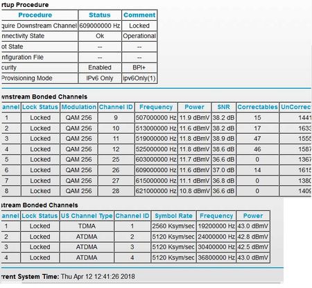 Update: ISP is saying that my Receive frequencies are too high and they're coming to correct. I'll update after the service call, but please advise if there are any other flags/concerns.