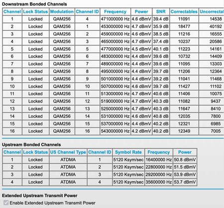 I checked out the links you sent. According to that, the correctables/uncorrectables are due to noise. So it seems like the issue has to do with my line or the ISP. Given that the ISP has been out here before and said their signal is fine, I'm suspecting something's bad in the line.