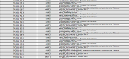 "Explanation: The cable modem has sent 16 Ranging Request (RNG-REQ) messages without receiving a Ranging Response (RNG-RSP) message in reply from the CMTS. The cable modem is therefore resetting its cable interface and restarting the registration process. This typically is caused by noise on the upstream that causes the loss of MAC-layer messages. Noise could also raise the signal-to-noise ratio (SNR) on the upstream to a point where the cable modem’s power level is insufficient to transmit any messages. If the cable modem cannot raise its upstream transmit power level to a level that allows successful communication within the maximum timeout period, it resets its cable interface and restarts the registration process. This error message is DOCSIS event message is R03.0, Ranging Request."