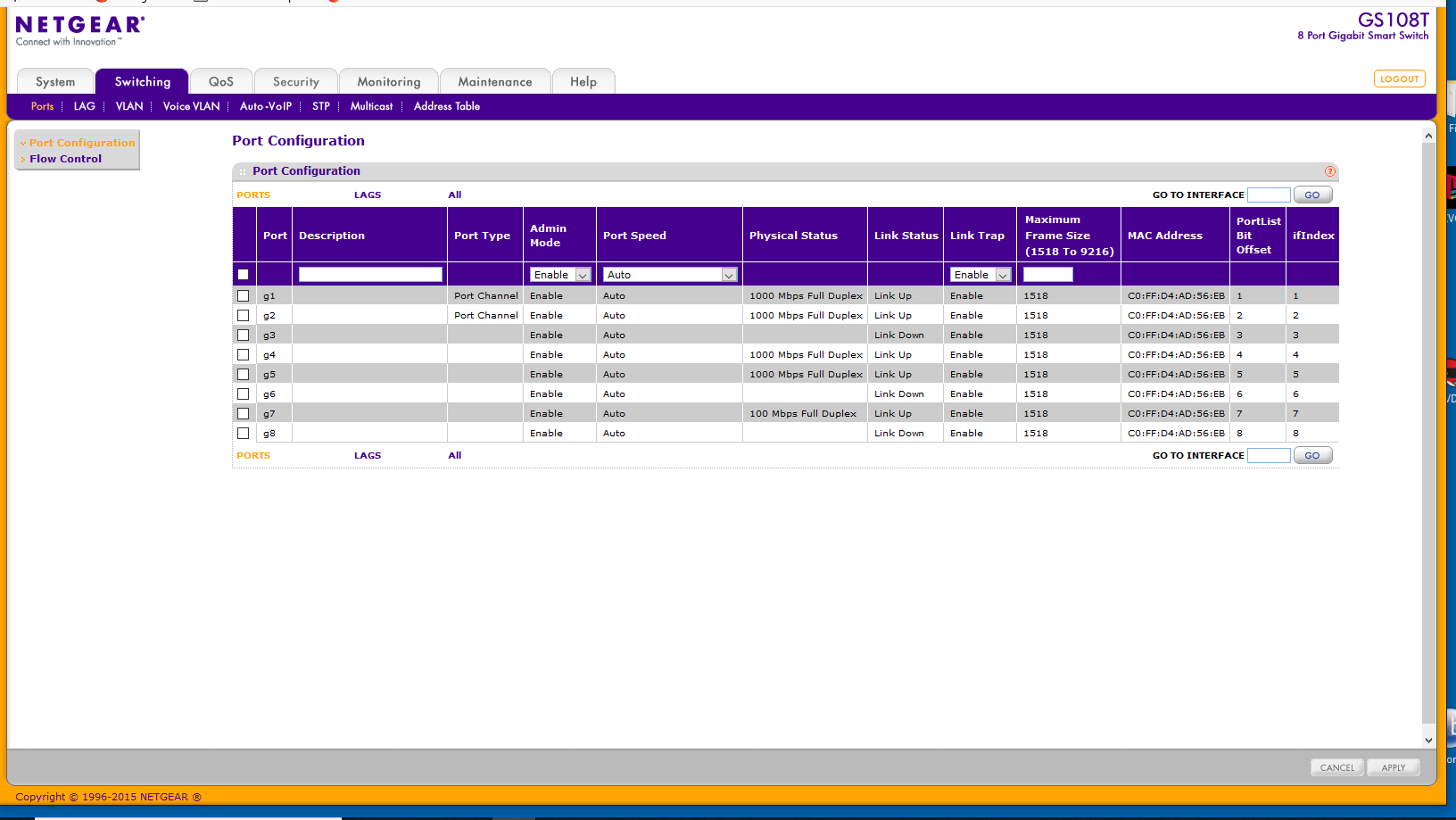 I have my GS108Tv2 router connected to a Synology 1815 NAS, a couple PCs and of course an internet connection through a D-Link GB Switch DGS-10240. All direct connections through the router work very well and I get transfer speeds to the NAS around 100 to 120 Mbs. However when I plug into other jacks managed by the D-Link switch my transfer speeds to the NAS drop to 10-11 Mbs. In reviewing the router port information I noticed that the Link-Up Speed for the port where the internet is connected is only operating at 100 mbs Full Duplex. All other ports in use are operating at 1gbs. Also there is no way to manually set the port higher. Testing the output from the switch I verified it's running at 1gbs. In fact another NAS I have connected directly to the switch has no file transfer issues regardless of where I am plugged in my network. The screenshot attached shows the port information.