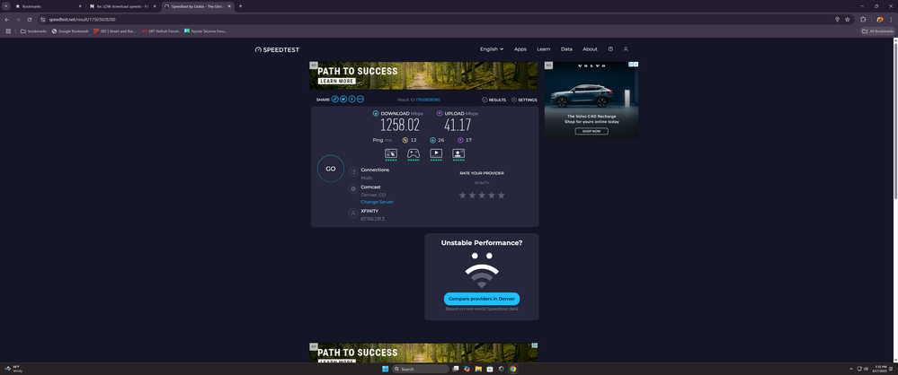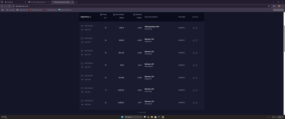 i use ookla with new pc a ultra 9 285k with a rtx 5080 2 4 TB SSD with wifi 7 with a asus z890 hero motherboard is on ethernet on the 5G port on the ax2700 its the same using the 2.5 G port as well but i get the same result on my phone when i test it on netgear app plus when i had my old equipment had a arris s33 modem then a asus wifi router would get 949 Mbps constantly with no issues on the same sites .