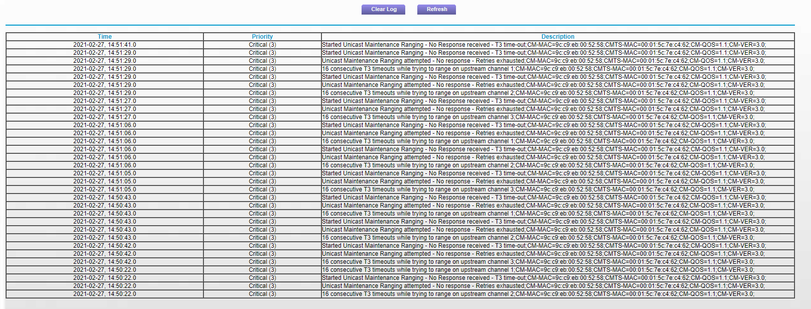 My line has no splitters or any other devices on it- only thing I can think of that could be my issues versus my ISPs is that the tech installed a needlessly long coax cable between the drop and my C6220, like 15 feet long. I'm planning to run out and buy a shorter coax cable just to ensure that's not the issue, but I thought I would drop my Cable connection status and event log in case something else stuck out.