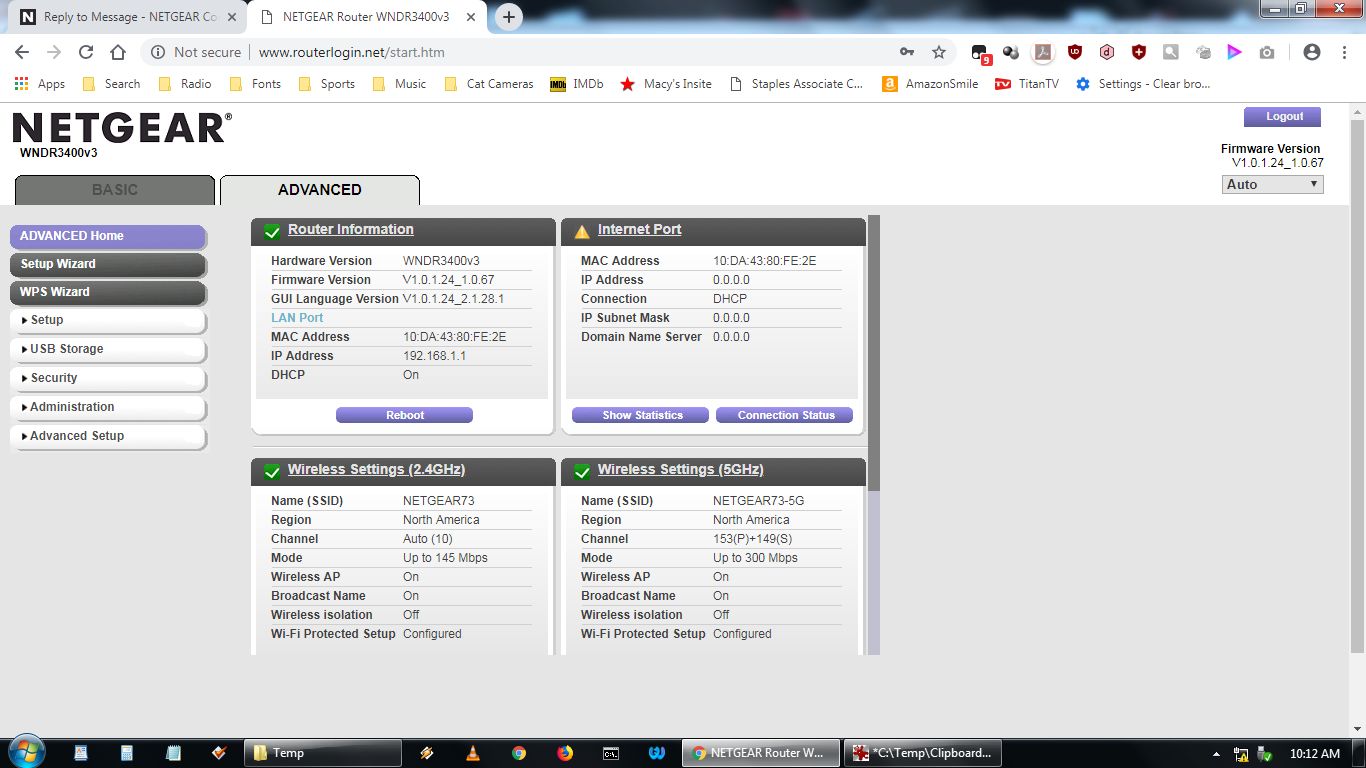 Once you are convenced that you have all good equipment and cables and signals up to the WNDR and that it is the isolated problem, save a copy of the configuration, download local a copy of the latest firmware, reset the WNDR via the reset button, get back into the WNDR, do a firmware update from the local file, then try again.