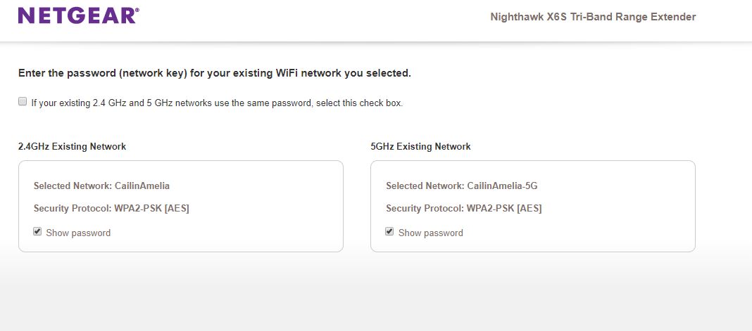 I upgraded the firm ware for my Wifi Router and extenders -Nighthawk X6s Tri Band Extender. Now when I do a wifi extender setup, I can select the 2.4 Ghz and 5 Ghz Network that I want to extend, but when I get to the next page where it wants me to Enter the password (network key) for your existing WiFi network you selected. I can check the box where it says "If your existing 2.4 GHz and 5 GHz networks use the same password, select this check box." but I cannot click the "next" button. As a result, the extenders will not connect to my router.