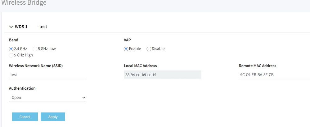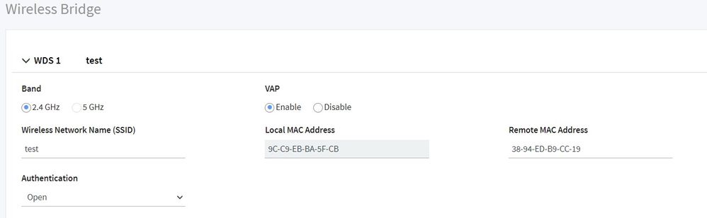 Unfortunately, my WAC564 with the same WDS settings does not connect to the wireless bridge.