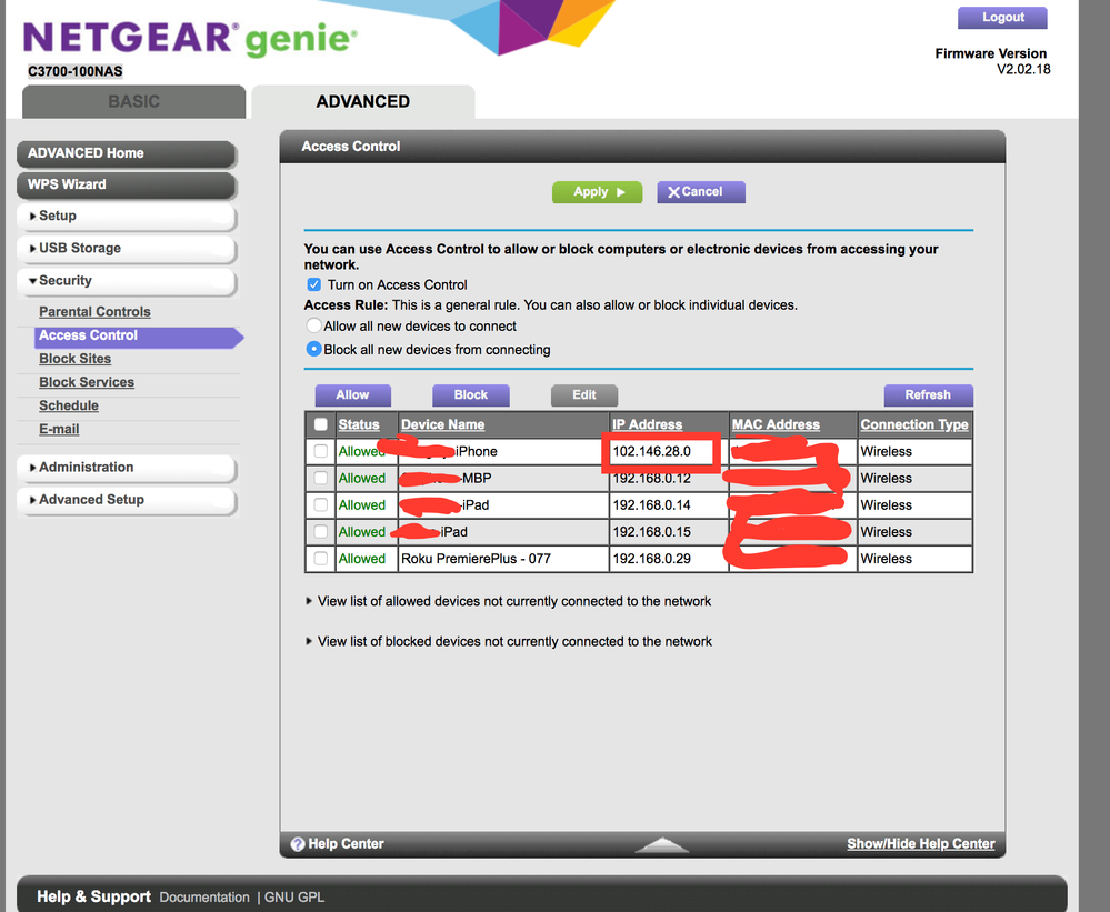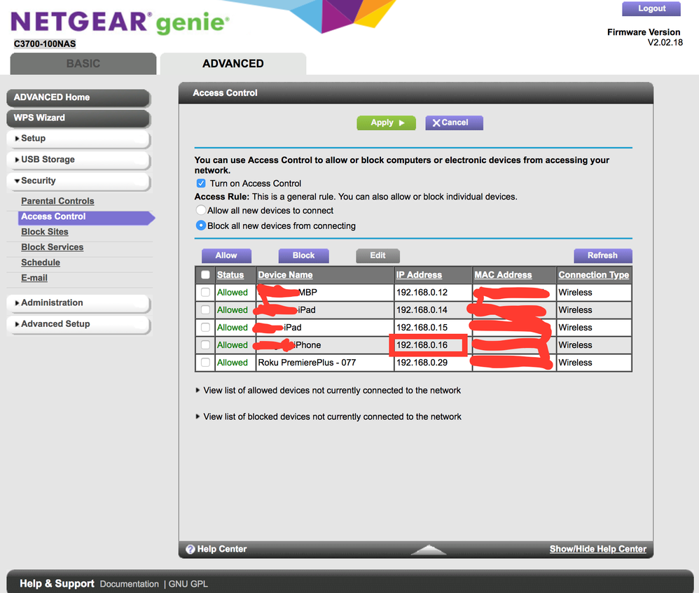 If I turn off my wifi on my phone then and refresh the list of devices again it will of course go off the network and not be seen again until my iphone or my wife's connects to the network. The phones still receive the proper IP though of that private range so I think maybe I got infiltrated by VPN filter big security issue recently, but I have followed the steps to get rid of the malware by factory restore then upgrading with the bug fix from Netgear and then locking down all access except for my known devices mac addresses.