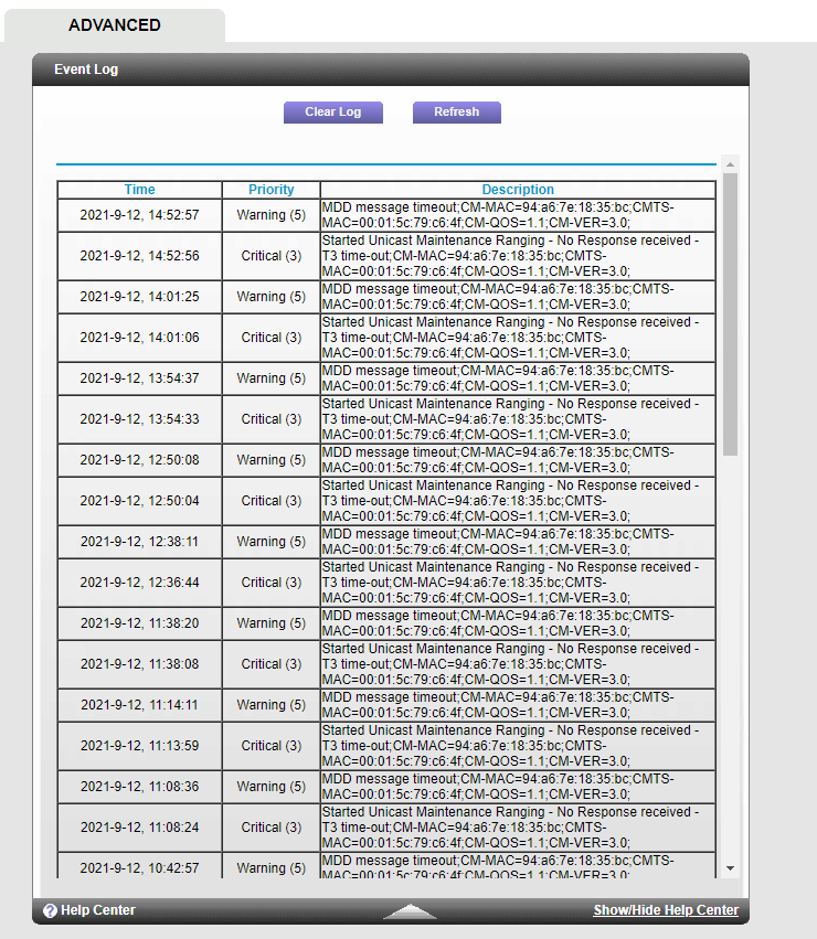 | 2021-9-12, 07:05:29 | Critical (3) | Started Unicast Maintenance Ranging - No Response received - T3 time-out;CM-MAC=94:a6:7e:18:35:bc;CMTS-MAC=00:01:5c:79:c6:4f;CM-QOS=1.1;CM-VER=3.0; |