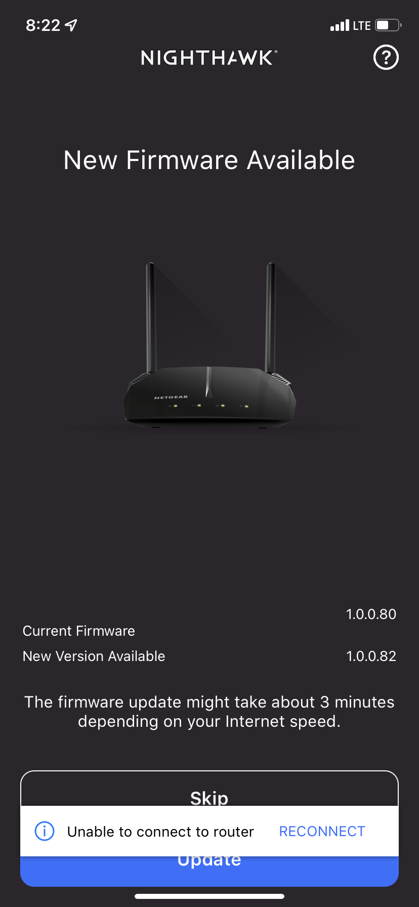 So within the past 2 hours I have attempted to update the firmware on my R6120 after I saw in supplied photo that an update was available through my Nighthawk app on my iPhone XR. However, when attempting to download the file through the app, the download completely called it quits and it completely turned off my wifi. I have tried a couple ways, from the reported 30/30/30 trick I’ve read online, to just literally unplugging it and re-plugging it in, but I either get the power light flashing once (and I let it sit there for at time of 3, 5, 10, and even 20 minutes flashing in this state) to the power light and the ethernet port flashing.