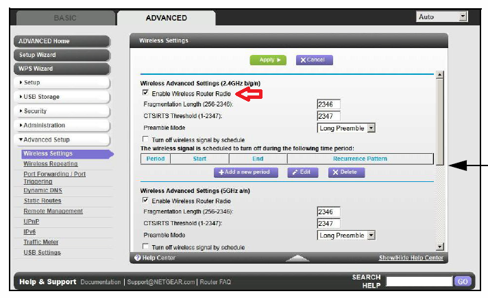 Wireless button on the outside of the device. Or from the router's GUI. If you want to use custom SSID names, etc, find additional settings under the Set Up Wizard > Wireless in the navigation pane.