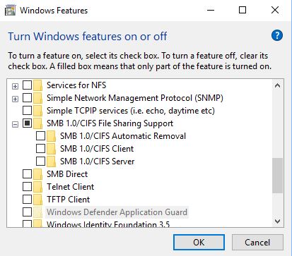 From my read, the SMBv1 needs to be disabled; here is a screen shot of my system's features: