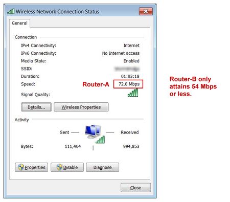Wow! Thanks Antinode, I definitely wouldn't have caught that auto channel feature. Using a little utility called 'Wifi Info View' I was able to see that both routers were choosing Ch-4 in Auto Mode. I'm only showing the faster router on Ch-4 below and then I manually change the channel to 11 on Router-B (slower router). Also tried Ch-6.