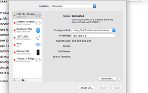 > Router hardwired to Macbook via Belkin network/USB adapter.