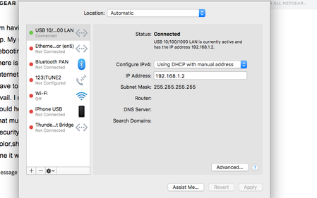 > Router hardwired to Macbook via Belkin network/USB adapter.