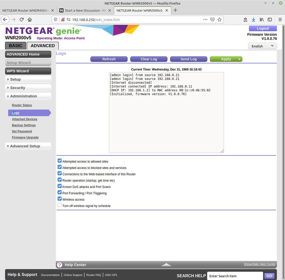 My main wireless router is a NetGear WNDR4500v2, it shows the correct time and date in the log files. The only LAN cable plugged into the WNDR4500v3 goes to the WNR2000v5's yellow port labeled internet. I have two desktops plugged into the WNR2000v5's LAN ports.