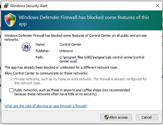 Windows Defender Firewall has blocked some features of control center.exe. The message is "This app has already been blocked or unblocked for a different network type" I don't understand the message. Is control center.exe needed for my R7000 network? I do have a printer on the R7000 USB port.