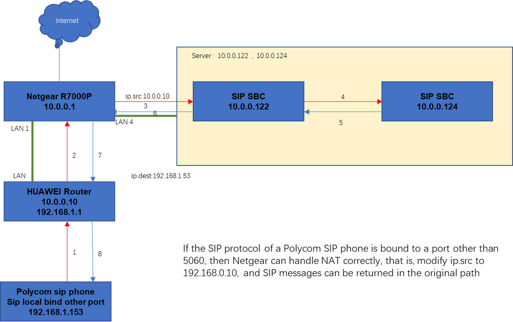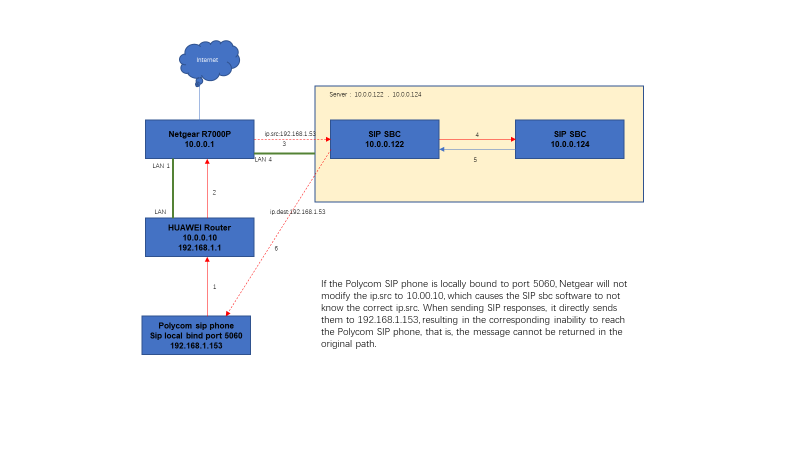 Additionally, I understand what you're saying. The R7000P forwards packets from one LAN port to another, which is a function of a layer 2 switch and does not trigger routing or NAT processing. Binding a Polycom SIP phone to port 5060 and a non 5060 port yields different results. This is because Huawei routers have processed SIP ALG, meaning that they have not modified the ip.src. Therefore, when the message reaches SBC, the ip.src remains at 192.168.1.153 When SBC responds to SIP REGSITER requests, it will first send to the gateway (192.168.0.1). R7000P does not know where 192.168.1. x is located, so as long as a static route 192.168.1.0/24 to 192.168.0.10 is configured on R7000P, which is a Huawei router, I followed this method and the problem was solved.