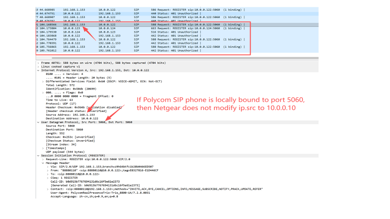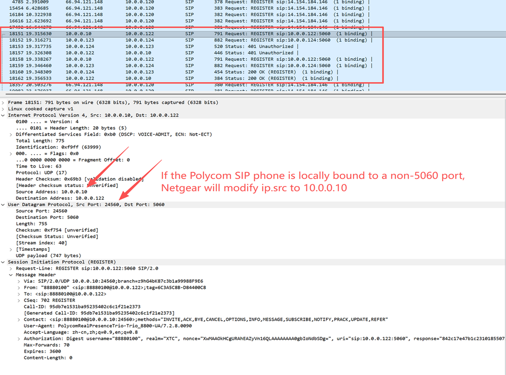 the Netgear R7000P router does not modify the value of the ip.src field of the UDP message when forwarding SIP (UDP). The specific situation is shown in the following picture: