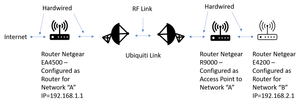 I have a network configured as shown below. The issue is that the E4200 configured with a different subnet IP (192.168.2.xxx) vs, the EA4500 with IP 192.168.1.xxx will not pick up an internet connect...