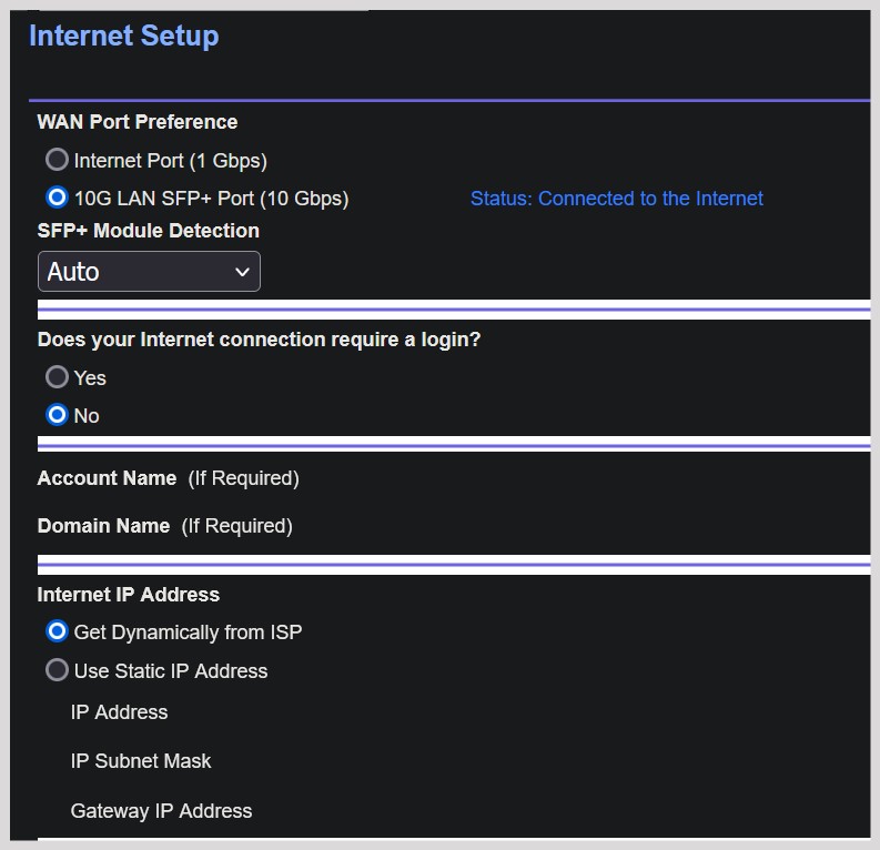 On my R9000, the SPF+ port can be configured for WAN function only. I use a SPF+/RJ45 adapter with an Ethernet cable connected to the 2.5 Gbps port on my modem. See attached.