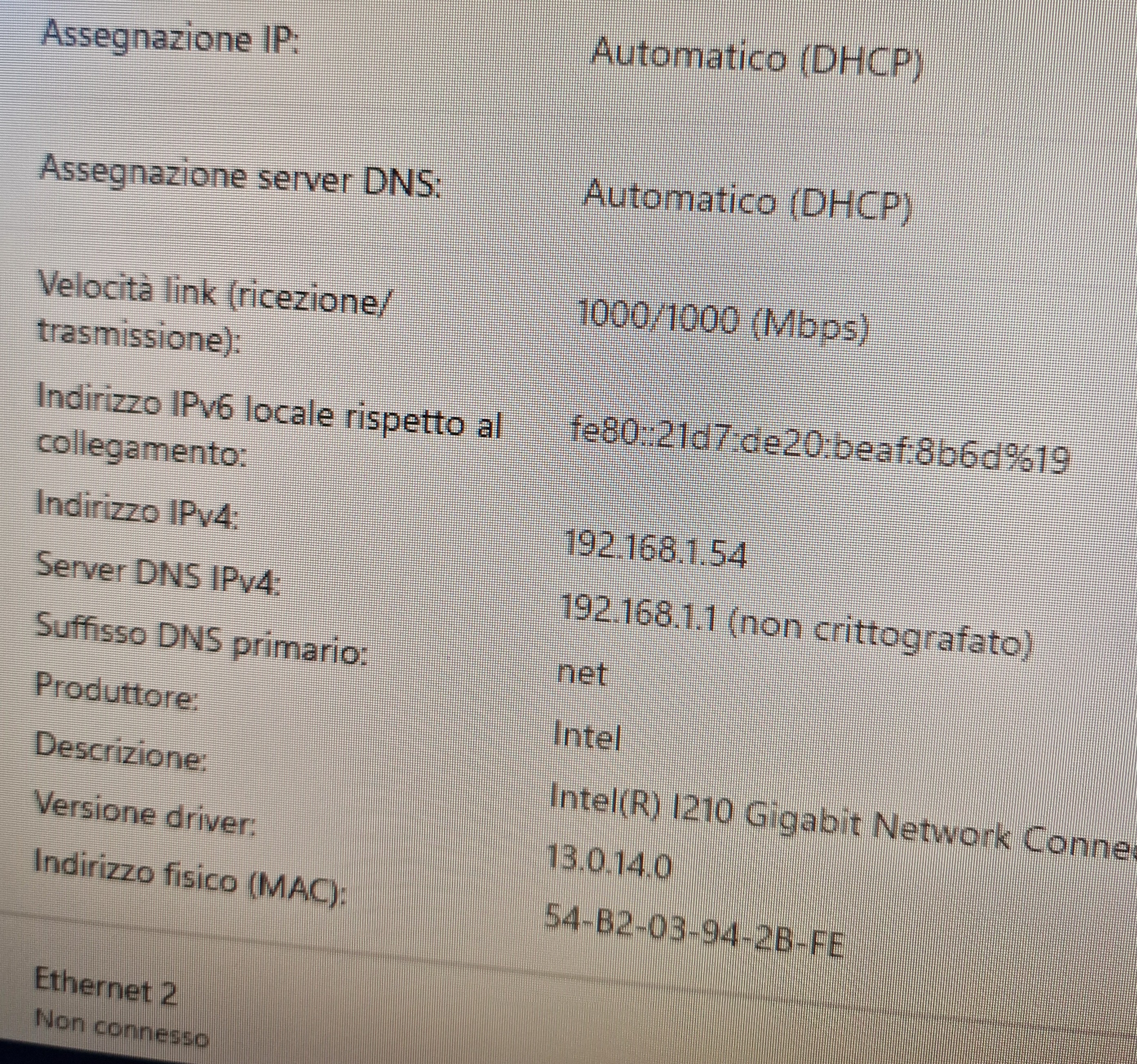 Per quanto riguarda la NIC (scheda di interfaccia di rete), avremmo bisogno uno screenshot della velocità di collegamento Ethernet, in modo da poter ottenere maggiori informazioni sulla scheda di interfaccia di rete.