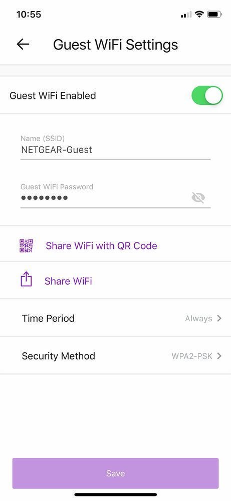 3. Dopo averla attivata, crea un Network Name/SSID e imposta la password. Da lì puoi condividere il WiFi tramite QR Code, selezionare un tempo massimo in cui la rete ospite sia attiva e scegliere il metodo di sicurezza.
