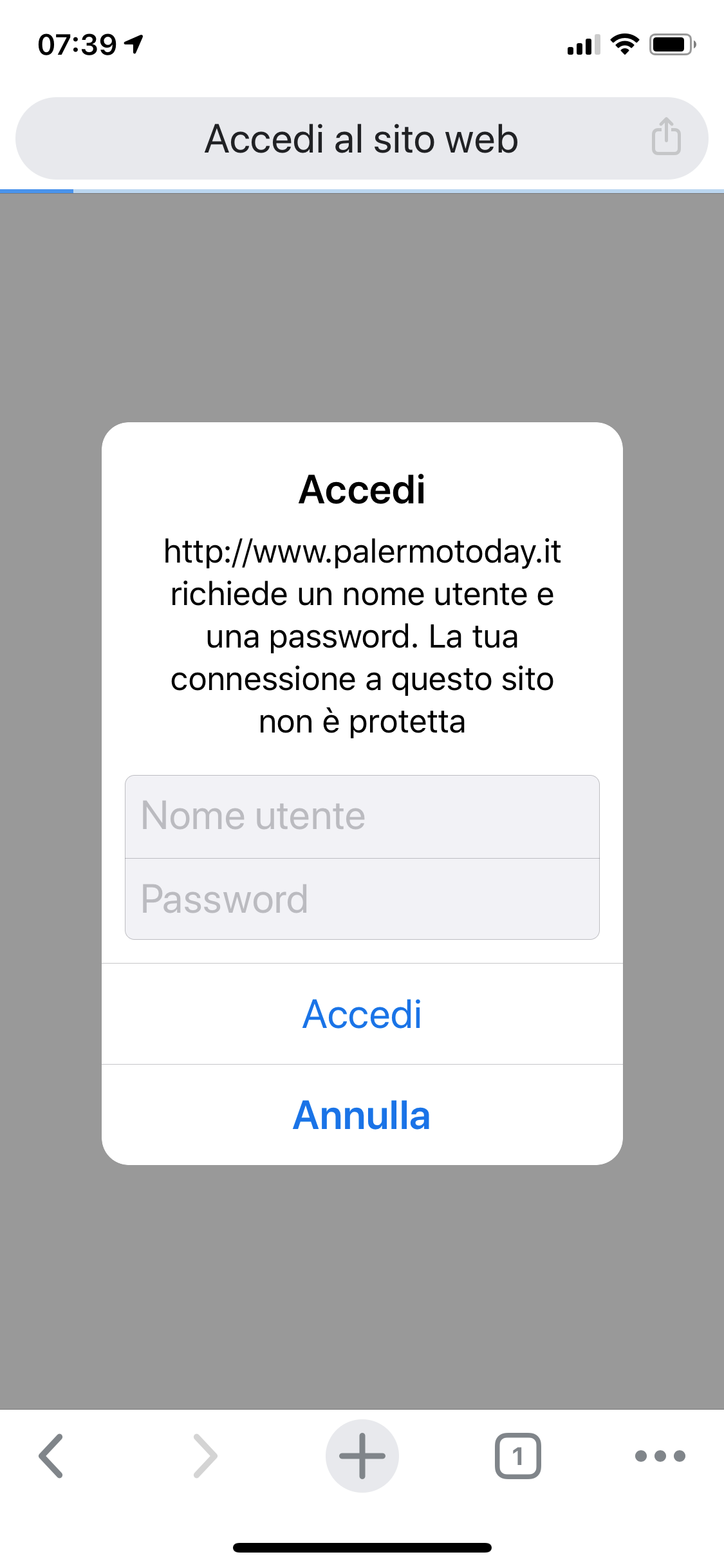 Adesso succede che se mi collego con il portatile (è un Mac) non ho problemi ad accedere al sito dove precedentemente non potevo visitare (ad es Palermo Today). Mentre se voglio visitare lo stesso sito con iPhone non posso e mi si apre una finestra che richiede un nome utente e una password. dicendomi che la mia connessione a questo sito non è protetta, come da screenshot allegato.