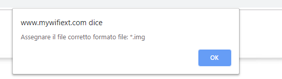 Vorrei aggiornare il firmare del mio extender alla versione 1.0.2.64. Ho comprato il mio extender nel 2017 e non ho mai fatto l'aggiornamento firmware per cui sono fermo alla versione 1.0.1.14. Ho seguito tutti i passi ma quando scelgo il file da caricare (ha estensione chk) mi esce un pop di errore che dice che il formato deve avere estensione .img (allego msg che compare).