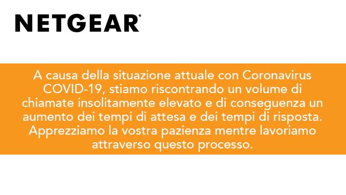 Grazie per la vostra pazienza e comprensione durante questo periodo. Come promemoria potete anche trovare articoli utili e passaggi per la risoluzione dei problemi su netgear.com/support o su community.netgear.com.