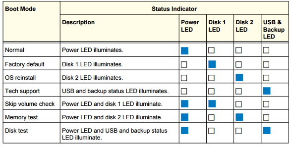 4. Per eseguire OS Reinstall, continui a tenere premuto il pulsante di Reset fino a quando il LED Power, LED USB, LED di stato backup, Led disco 1, e il LED disco 2 saranno illuminati.5. Prema il pulsante Backup per scorrere le opzioni della modalità di avvio.