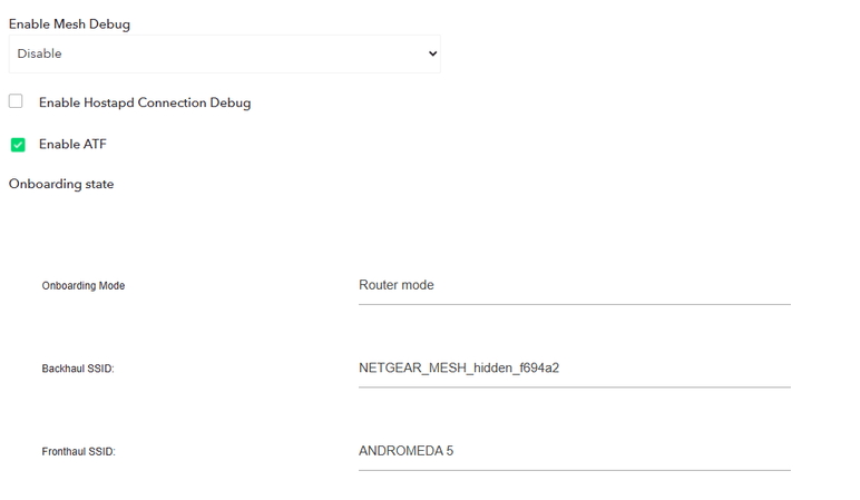 Thank you. I am seeing the hidden SSID's as the mac ID's in the Wifiman and Wifianalyzer apps. There's a backhaul mesh SSID in the debug page under the onboarding settings. See screenshot below.