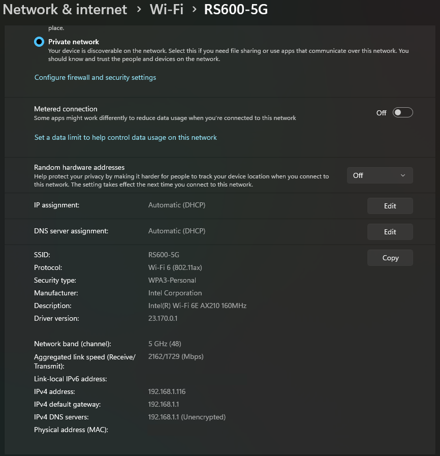 Just tested my RS600 here and getting same thing on a AX210 adapter PC on 5Ghz: