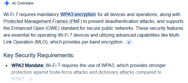 (Caveat: I have no personal experience with WiFi7.) However, it appears that using WiFi7 requires WPA3.