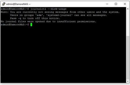 I have enabled SSH on my ReadyNAS and granted the default admin command SSH access. I can SSH to the NAS (using Putty) and logon with the admin command. I am issuing the command journalctl --disk-u...