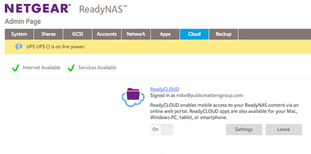 We have a ReadyNAS 104 which we use for backup. It's running the latest 6.8.0 firmware. ReadyCloud is enabled and logged in with an admin account. The admin page shows internet and services avail...