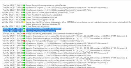 Netgear RN10400 , fw: 6.6.0, 2 x 1TB, RAID 1. User has been Auto deleted - all data lost. Can not acces local user home dir?!? Can someone check this? Or tell me, in which log can I check th...
