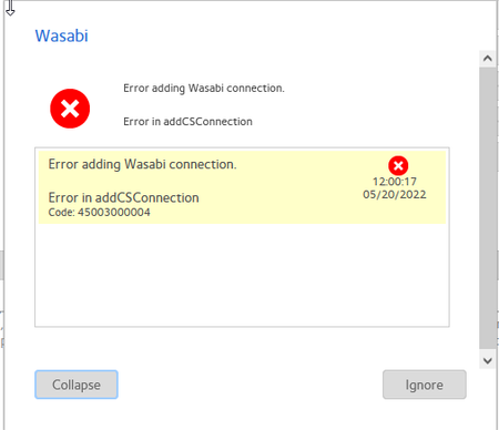 Hello eveyone, I am trying to set up a NAS and connect it to wasabi but when i add my secret and access keys i get an error message that says " Error in addCSConnection." I also cannot choose any buc...