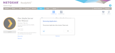So I am trying to uninstall an old instance of Plex from the ReadyNAS. All I see is the "Removing Application" screen where it stays until I just close the browser. See the pic below for a screenshot...