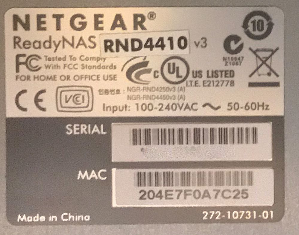 I have a very old (8 years?) ReadyNAS NV+ that just died (no power whatsoever). Model description included in the pictures below. Clearly I need to recover the data, looking for the most cost effective solution. I don't intend to stay with a NAS solution as I can put everything on a much faster 6TB USB 3.0 drive significantly cheaper (even buying 2x for backup), so I just need a way to read off the contents. I tried contacting Netgear but all my registration data for this unit is missing (I replaced the chassis under warranty early in it's life so I know it was registered at some point) but given it's age I doubt there's anything they'll do for me. I found somesimilar diskless units online, thought I might buy one of those and throw in the old drives. Just can't be sure how compatible these units are (example). Also hate to pay that kind of money for a one-time data recovery if there's a cheaper option...