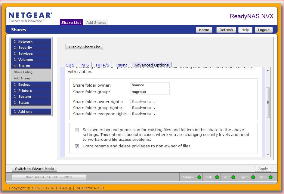 3. Here is the advanced options tab on my NVX. As you can see it is set to nogroup (which is the default, even on x-86 units).