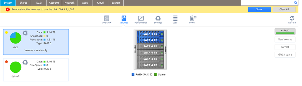 I had 5 2TB and then I added 1 4TB drive and I didn't gain any storage but a new data -1 appeared. I have since added 5 more 4 TB drives and let the NAS resync between each drive that I have added. Why hasn't the storage increased? Why am I being asked to remove inactive volumes on 4 drives that I just added?