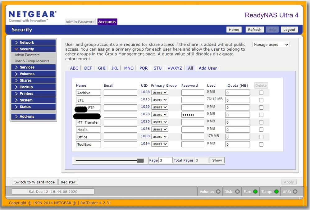 Actual, correct "Users" and "groups" remain listed, intermeshed with shares in the ReadyNAS Frontview menu, [Security> User & Group Accounts]