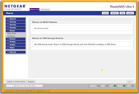 Model: RNDU4000 ReadyNAS Ultra 4 [X-RAID2] Firmware: RAIDiator 4.2.31 Shares are no longer accessable. When I log in to ReadyNAS Frontview as ADMIN, the [Share>Share Listing] states, "N...