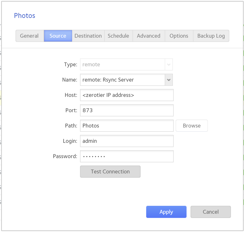 I am assuming you want to do a NAS->NAS backup. The main thing is to use the remote NAS ZeroTier IP address for the backup host.