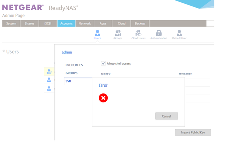 Hello. When I try to follow /ReadyNAS-OS-6-SSH-log-in-using-a-public-private-key-pair I get this less-than-helpful error message. Can someone give me a hint of what to do? I can't find any related me...