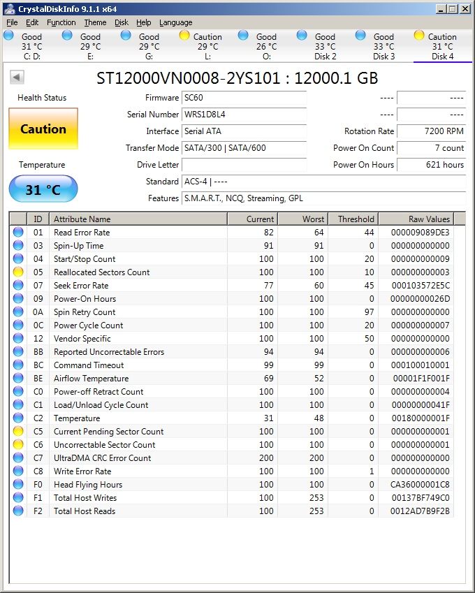 Anyway. Backed up the data which still was on the 12TB on the PC (on 2 of the 8TB from the old array ), and backing up the data which is on the NAS in the DEGRADED array on the other 2 8TB disks. I took off the FAILED disk, put it on the PC (see CrystalDisk Info below), updated and opened SeaTools, it PASSED the Quick test, currently running (70% done) the”Long Self Test” . Which other test I should run? SeaTools (5.1.249) has three Extended tests (Long Self, Long Generic and 2 Minute Generic) and a “Fix All” menu ( Short and Long) which I presume could exclude Bad Blocks.